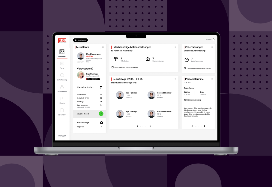 Parallel zur mobilen App für die Mitarbeitenden im Feld ist BKL@Web die zentrale Weboberfläche für Disponenten und kaufmännische Mitarbeitende. BKL@Web dient vor allem als Prüfungs- und Verwaltungstool für Arbeits- und Projektzeiten, Urlaubsanträge, Krankmeldungen sowie zur Erstellung von Berichten für die Lohnabrechnung.